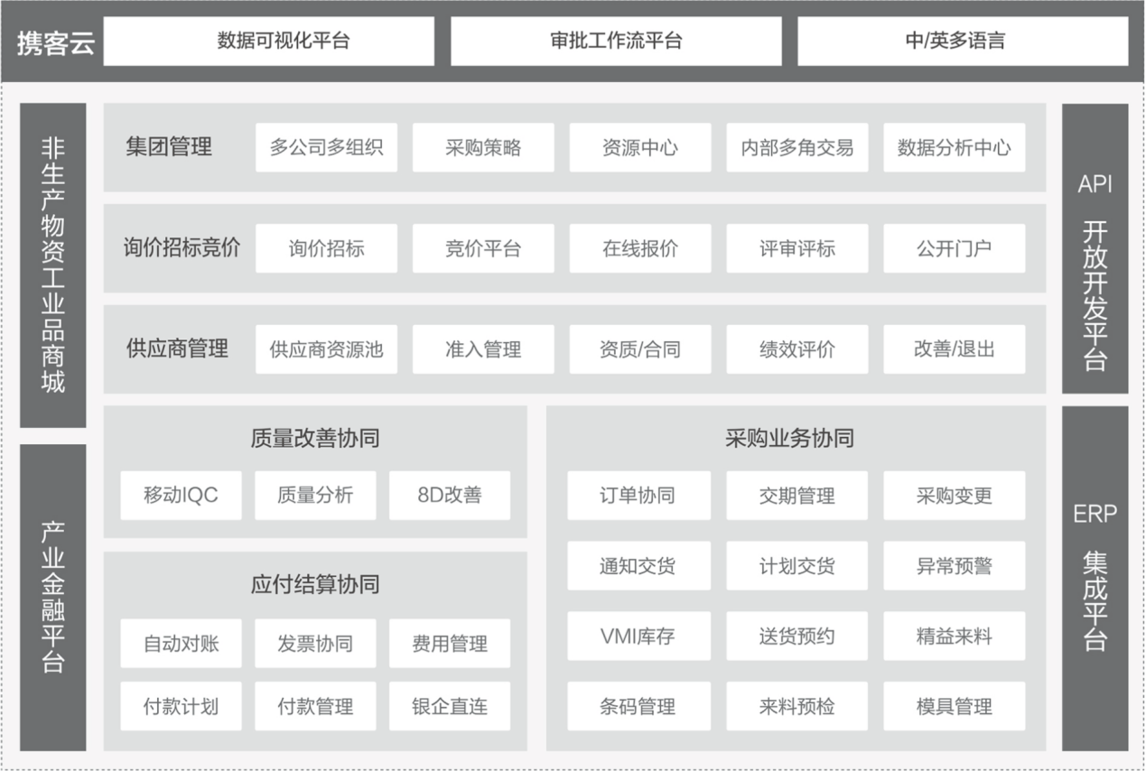 攜客云標準化功能模塊,是上千家制造企業(yè)管理經(jīng)驗的產(chǎn)品化平臺,已擁有完備的標準化功能和彈性化的流程,可滿足普遍的制造企業(yè)對于供應(yīng)鏈的管理需求。目前,攜客云已經(jīng)累積近20萬家企業(yè)的供應(yīng)鏈上供應(yīng)商資源,并且自然形成3C、家電、機械、家具……等多個產(chǎn)業(yè)供應(yīng)鏈資源的聚集,逐漸形成產(chǎn)業(yè)鏈供應(yīng)鏈資源的可復(fù)用化,協(xié)助企業(yè)能夠在需要時,快速、廣泛地對接產(chǎn)業(yè)內(nèi)的其它所需供應(yīng)資源。