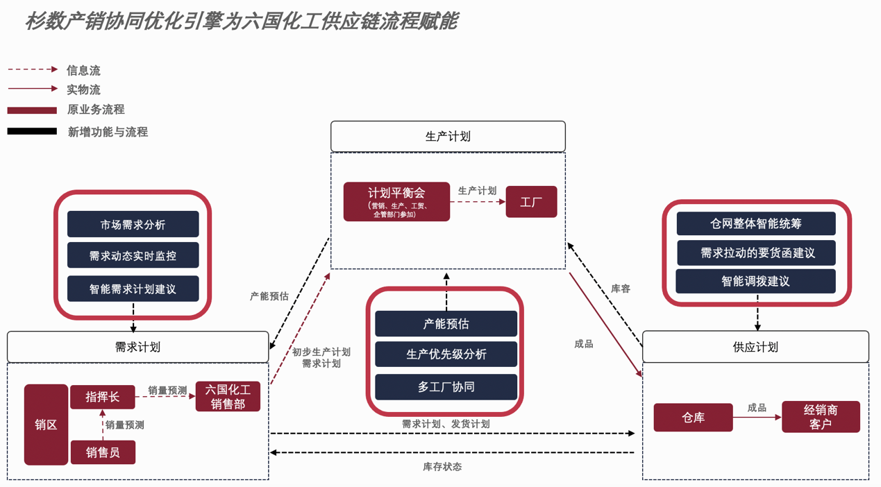 通過搭建一套產銷協同系統,與六國現有SAP ERP及SMS對接,引入AI預測算法及運籌優化算法,優化需求計劃、優化補貨及庫存策略、優化生產計劃、實現產銷協同模擬,以應對產品需求多樣性的市場,實現提升產銷協同能力、提高市場響應速度、提高投入產出比、提升精細化管理能力。