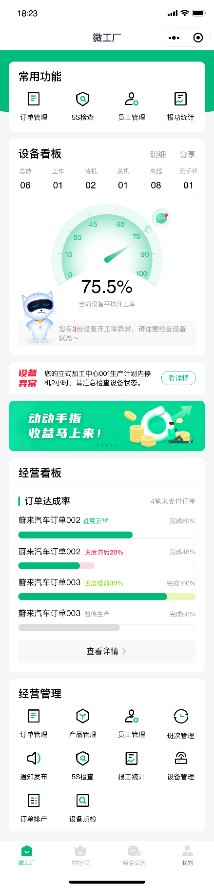 工廠整體設備開工率看板可主動推送當前設備的開工率及健康狀況,以紅亮箱包公司管理者為代表的中小微制造業(yè)企業(yè)主,可及時遠程了解工廠實際開工表現(xiàn),從而可以更有目標性地進行產能優(yōu)化,提高設備整體利用率。