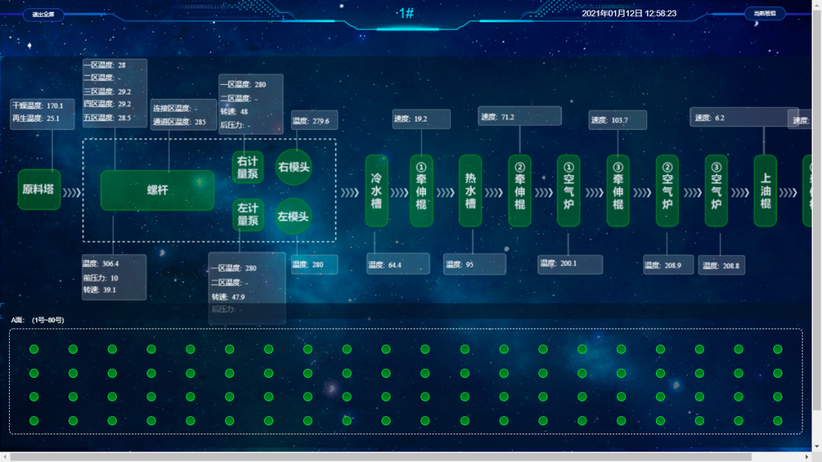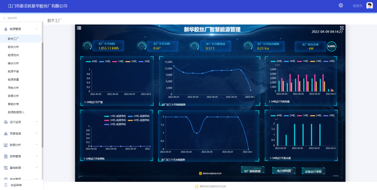第一,打造了新華膠絲廠能源數(shù)字工廠。通過能耗在線監(jiān)測(cè)系統(tǒng)實(shí)現(xiàn)對(duì)新華膠絲廠生產(chǎn)過程中能源消耗進(jìn)行監(jiān)測(cè)和生產(chǎn)批次管理數(shù)據(jù)對(duì)接,實(shí)時(shí)顯示新華膠絲廠4條生產(chǎn)線能耗、單耗等數(shù)據(jù),組態(tài)化大屏形式展示關(guān)注的能源指標(biāo),實(shí)現(xiàn)獨(dú)立靈活自適配,符合各種生產(chǎn)實(shí)際場(chǎng)景需求。任意關(guān)鍵數(shù)據(jù)指標(biāo)適配;豐富圖表、設(shè)備組件;配置靈活,即時(shí)生效,靈活調(diào)整;實(shí)時(shí)業(yè)務(wù)指標(biāo)、視頻監(jiān)控融合。