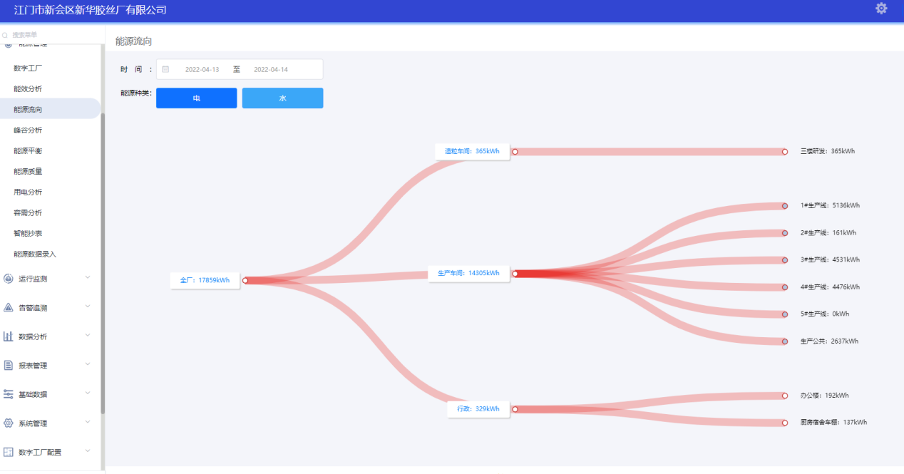 新華膠絲廠生產(chǎn)能源流向動(dòng)態(tài)監(jiān)測(cè)(全廠→生產(chǎn)車間→生產(chǎn)線→重點(diǎn)耗能設(shè)備等);通過能源流向圖,可以查看能源消耗的去向,也可以查看不同區(qū)域能源利用比例情況。該能流圖能夠?qū)崟r(shí)顯示生產(chǎn)過程中不同能源的消耗數(shù)據(jù)。