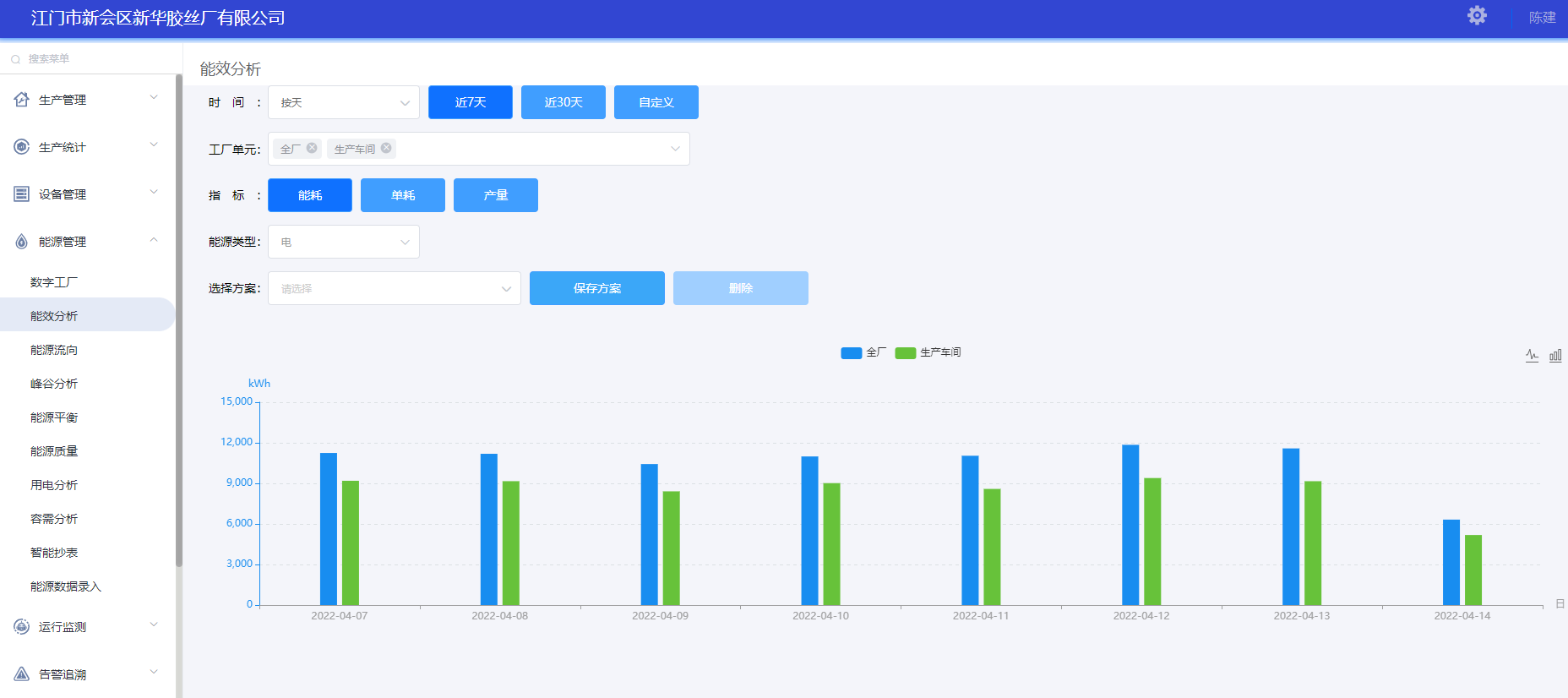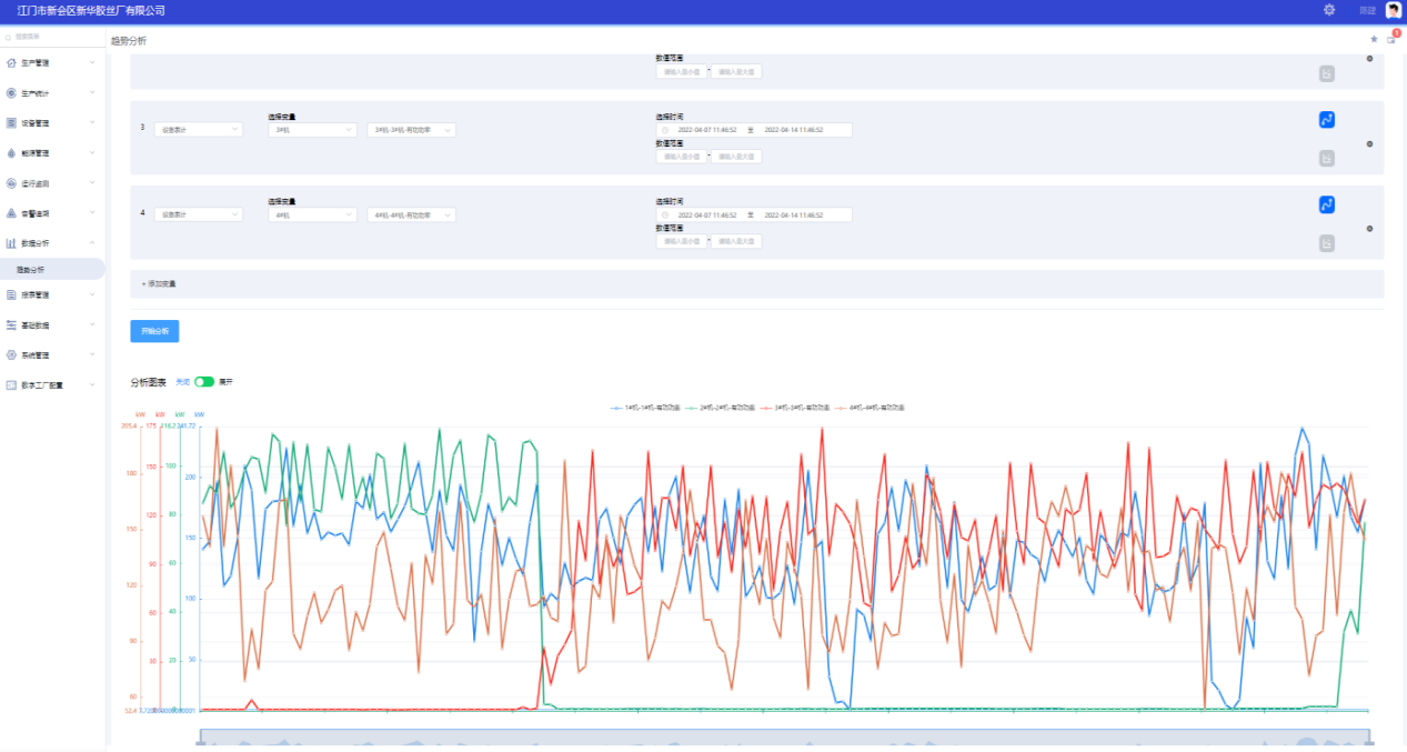 新華膠絲廠能效分析具有強(qiáng)大的歷史能耗數(shù)據(jù)追溯和分析功能,多維度分析企業(yè)不同生產(chǎn)區(qū)域/設(shè)備的能耗、能效水平及產(chǎn)量,可隨時(shí)查看某個(gè)區(qū)域/設(shè)備、時(shí)間、班組的能耗、能效、產(chǎn)量波動(dòng)情況,通過動(dòng)態(tài)的圖形顯示,快速了解是否有異常情況,從而對(duì)生產(chǎn)、管理、工藝及時(shí)進(jìn)行指導(dǎo)和調(diào)整,使新華膠絲廠生產(chǎn)過程的單位能耗和能源效率保持在科學(xué)、合理水平。