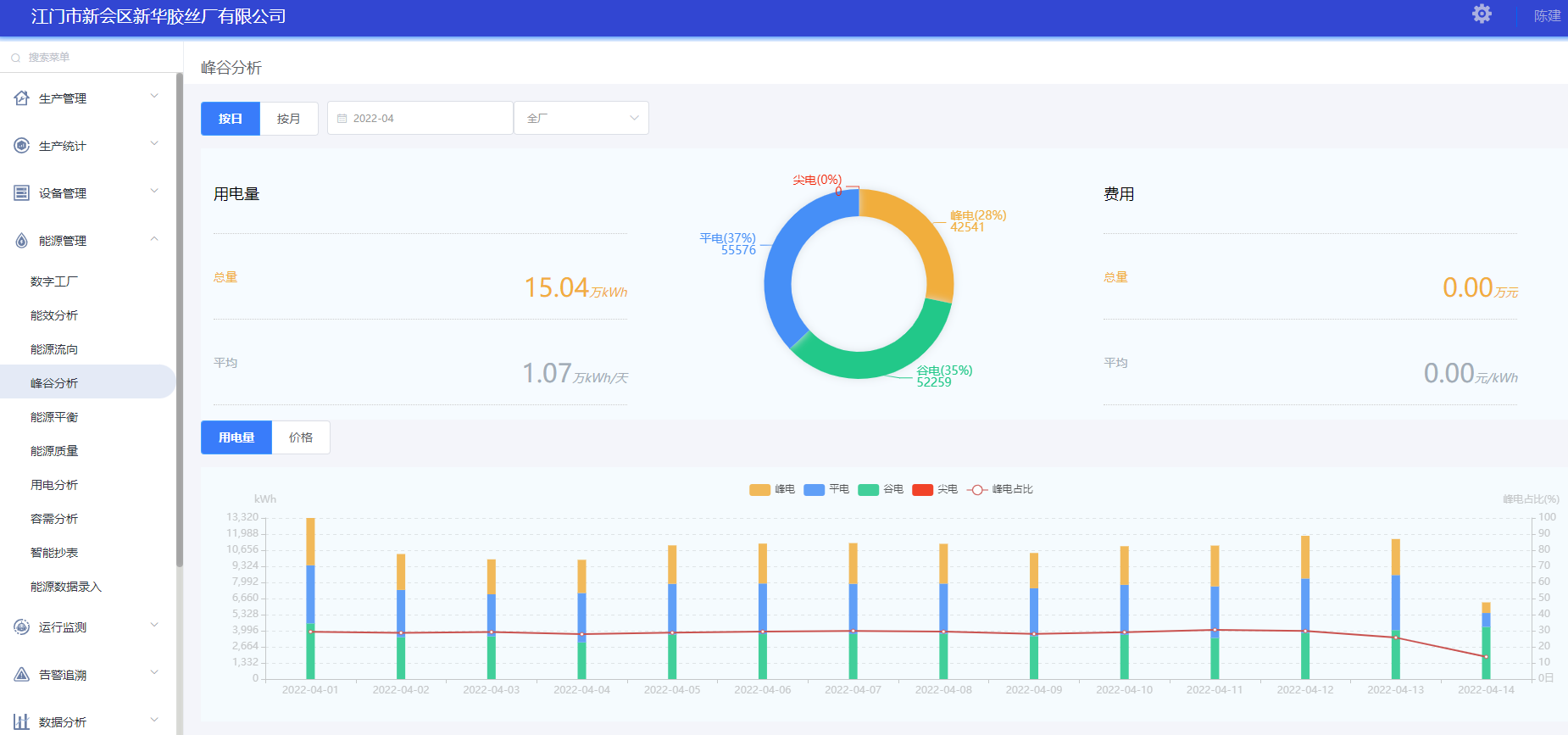 新華膠絲廠生產(chǎn)用電峰谷平數(shù)據(jù)在線監(jiān)測(cè),反映企業(yè)錯(cuò)峰用電實(shí)際狀況、錯(cuò)峰用電占比情況。對(duì)企業(yè)歷史用電量及電費(fèi)(錄入)進(jìn)行統(tǒng)計(jì)分析,有助于合理調(diào)度高耗能設(shè)備啟停區(qū)間,減少峰電比例,節(jié)約生產(chǎn)能源成本。展示各廠峰谷用電的實(shí)物量及占比,通過峰谷平用電比例指導(dǎo)車間及工序合理排產(chǎn),提高用電的效率和經(jīng)濟(jì)性。