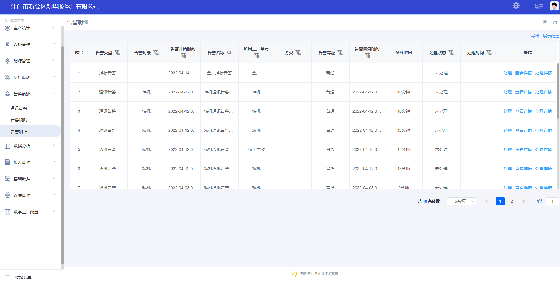 告警追溯模塊實(shí)現(xiàn)設(shè)備運(yùn)行異常、能耗異常等生產(chǎn)異常實(shí)時(shí)告警與追溯。所有報(bào)警變量及其上、下限新華膠絲廠可以自定義,當(dāng)發(fā)生異常時(shí),對(duì)應(yīng)的工段或者設(shè)備以閃爍、改變顏色或發(fā)短信等告警形式提醒相關(guān)人員。告警晴雨表以廠區(qū)拓?fù)鋱D(工廠模型)的形式直觀展示,告警類型包括通訊告警、指標(biāo)告警、參數(shù)告警。