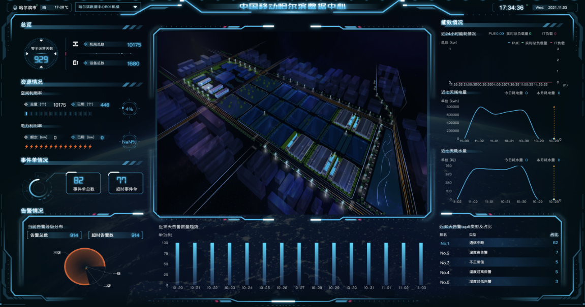 智能運維系統應用。哈爾濱數據中心立足打造超大數據中心智能運維系統標桿,在綠色節能、智能運維等能力進行技術探索,形成自主的知識產權,推動數據中心的戰略轉型,促進數據中心的全面發展。2021年哈爾濱數據中心作為牽頭單位,聯合地方高校、互聯網頭部企業等產學研合作伙伴,以《基于物聯網的大數據中心智能運維管理系統》為研究課題,成功申報黑龍江省2021年度百千萬工程重大專項。重大專項融合物聯網、人工智能、大數據、5G、AR/VR等技術,推動智能運維系統向智能可視、安全可靠、高效節能、人機協同演進,實現數據中心智能化運維水平全面升級。