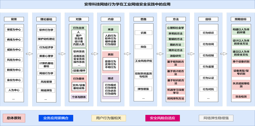 基于安帝科技創(chuàng)立的初衷和使命,結(jié)合當(dāng)前網(wǎng)絡(luò)安全在OT側(cè)發(fā)展的困境,我們選擇網(wǎng)絡(luò)行為學(xué)作為推動(dòng)OT網(wǎng)絡(luò)安全理論、技術(shù)、產(chǎn)品、方案、服務(wù)等發(fā)展的方法論指導(dǎo)。網(wǎng)絡(luò)行為學(xué)在OT側(cè)網(wǎng)絡(luò)安全能力建設(shè)中落地應(yīng)用,具體就是對(duì)主體(人、設(shè)備、軟件、系統(tǒng))的行為的分析評(píng)估,以及對(duì)客體或行為的受體(系統(tǒng)、軟件、硬件)的監(jiān)測(cè)分析,用以甄別異常、故障、網(wǎng)絡(luò)攻擊。試圖通過(guò)與用戶(hù)業(yè)務(wù)場(chǎng)景、業(yè)務(wù)要素的融合,發(fā)現(xiàn)業(yè)務(wù)行為的模式、特點(diǎn)、規(guī)律,從而建立正常業(yè)務(wù)行為的模型,達(dá)成拒絕一切非業(yè)務(wù)模型行為的目的。