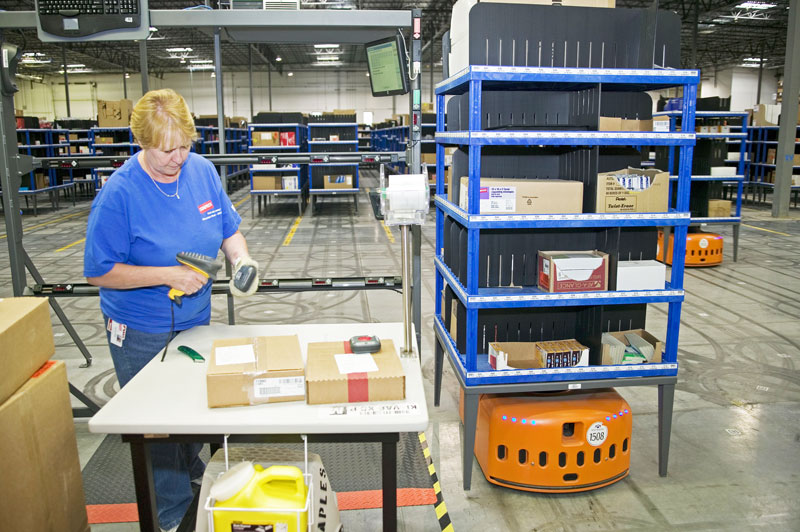 傳統有人倉庫,貨物采用人工揀選方式。即人員根據訂單信息,在貨架區域中尋找貨物。然后將找到所有貨物掃碼、裝框后交給打包環節。需要人力投入大、勞動強度較高、揀選效率難以滿足忙時要求。
