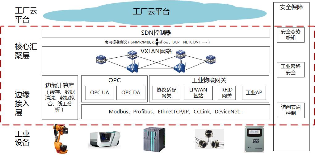 ADNET智能工廠網絡的建設內容位于上圖紅框中,含邊緣接入層、核心匯聚層和安全保障三部分,其中: